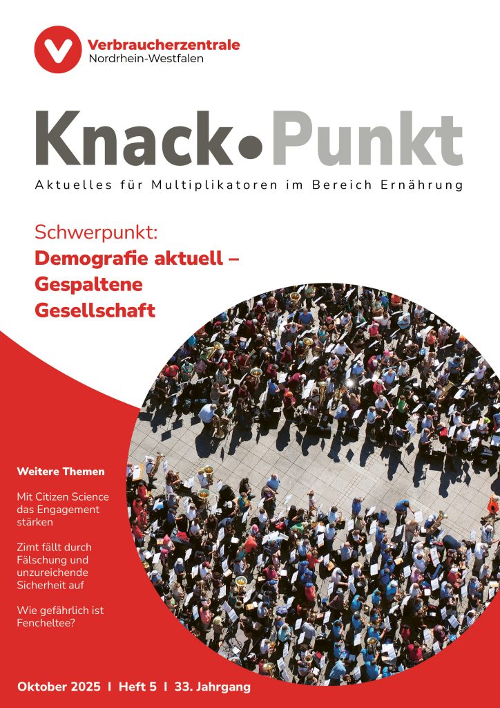 Das Thema ist vielschichtig und füllt dicke Bücher. Ich habe bestimmte aktuelle Aspekte herausgegriffen, die (nicht nur) für die Arbeit von Ernährungsfachkräften in der Verbraucherarbeit relevant sind und ein paar Denkanstöße zusammengetragen. Daraus wurde der Artikel „Gespaltene Gesellschaft – Demografie aktuell“, der gerade als Schwerpunktartikel im „KnackPunkt“ der Verbraucherzentrale NRW erschienen ist (Heft 5, Oktober 2025).
